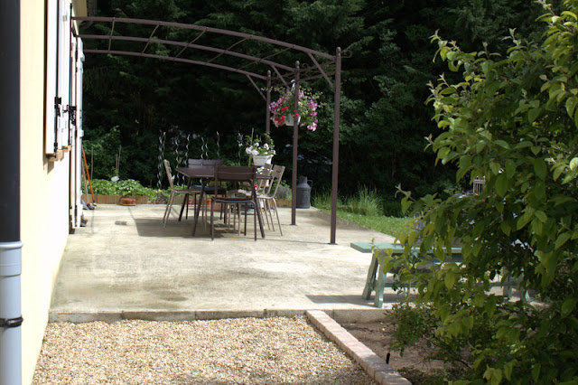 AVANT : une simple dalle de béton et une pergola en fer forgé un peu trop petite.