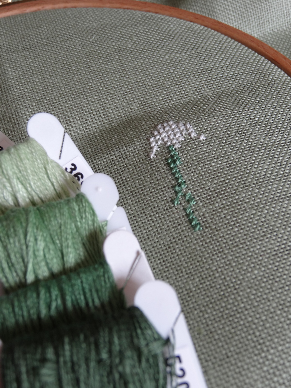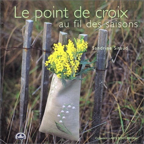 Ouvrage illustrant la couverture du livre “Le point de croix au fil des saisons”, de Sandrine Sitaud (éditions Solar / DMC), publié en 2001. Les fils utilisés sont ceux du modèle. Etamine de lin vert amande, 12 fils, La Croix et la Manière.