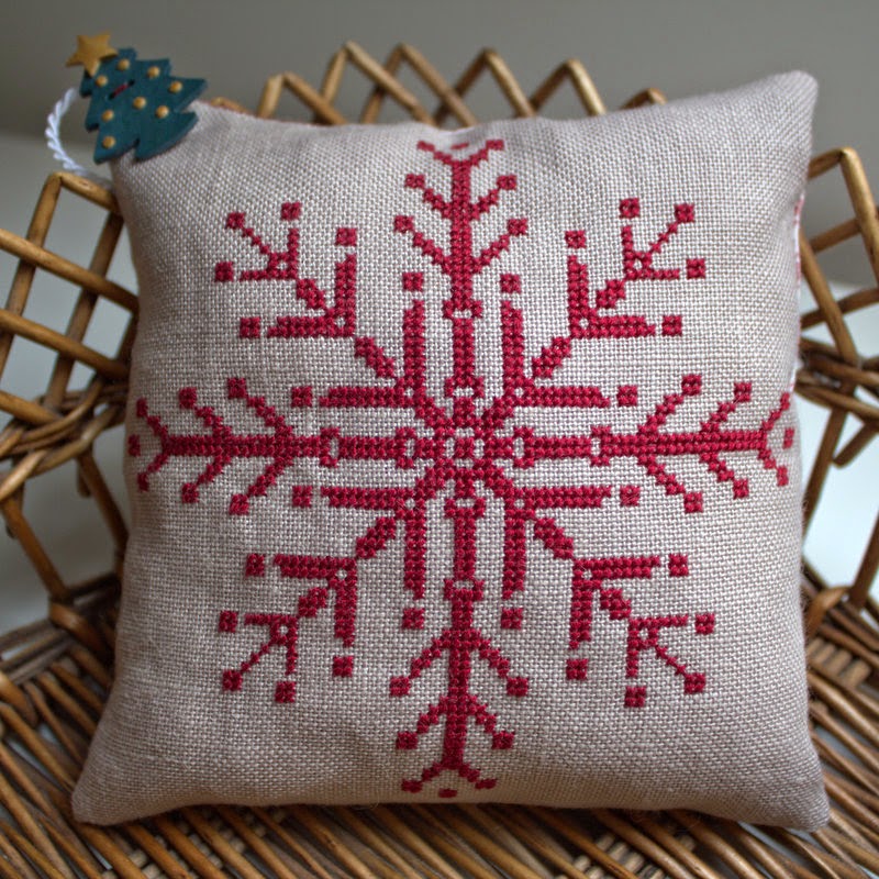 En détail : Motifs flocons provenant des livres “Point de croix au fil des saisons” (Sandrine Sitaud, ed. Solar, 2001) et “Rouge” (Agnès Delage-Calvet et Anne Sohier-Fournel, ed. Marabout). Brodés sur de la toile de lin rouge et blanche de ma réserve, et toile de lin Zweigart Belfast coloris nougat. Fil DMC coloris 815 et blanc. Bouton sapin de ma réserve.