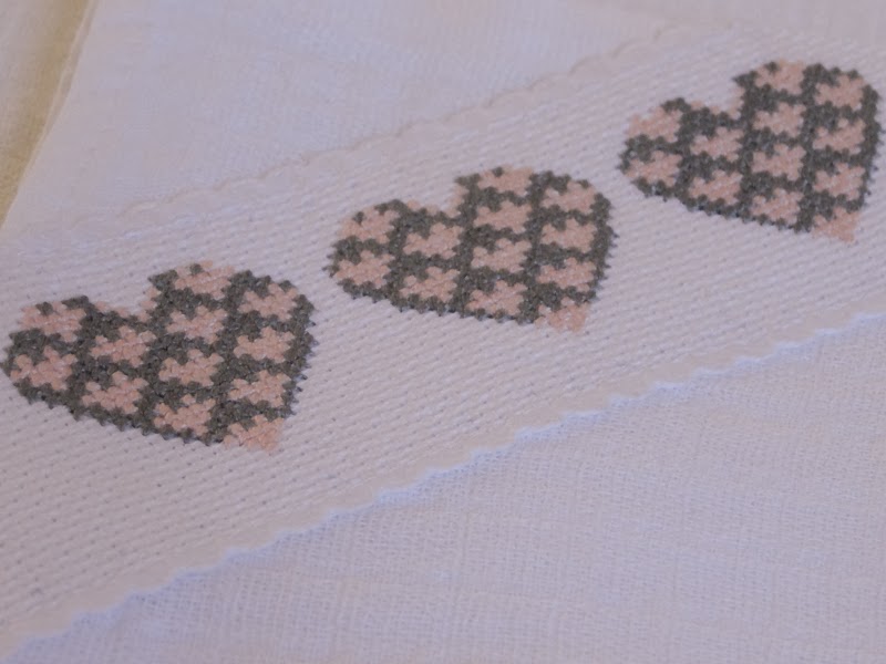 C’est très facile à faire : un galon brodé et cousu dans l’angle d’un lange acheté dans le commerce. J’en avais réalisés plusieurs lors de la naissance de mes deux garçons. Je les garde en souvenir, et je les ai sortis de leur boîte pour vous les présenter.