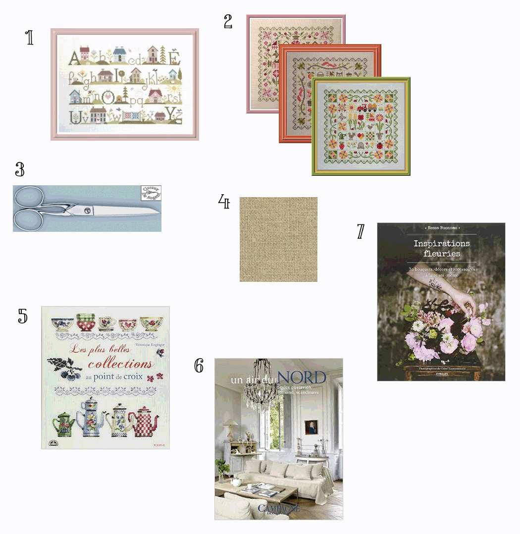 1. Fiche “ABC des maisons” de Jardin Privé / 2. toujours chez Jardin Privé, les fiches de la collection Patchwork, dont j’ai déjà brodé le modèle Hiver / 3. des ciseaux lingère Nogent / 4. de la toile de lin Zweigart Edinburgh coloris flax (lin clair) / 5. le nouveau livre de Véronique Enginger / 5. “Un air du Nord” dans la collection Campagne Décoration / 6. “Inspirations fleuries” de Nessa Buonomo.