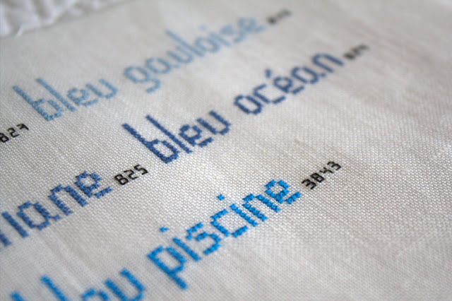 il s'agit d'un modèle commercialisé par Alice & Co, mais l'ordre des couleurs est celui du nuancier de la marque DMC. Je n'ai pas encore décidé du montage, mais ce sera soit des fiches à ranger dans un coffret ou un livret type accordéon, je pense.