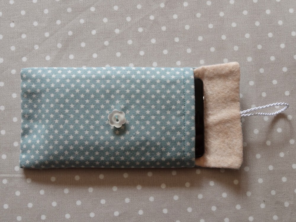 Un étui vite fait pour mon nouveau téléphone, d’après le tuto de la pochette express. Le tissu extérieur est un tissu mini étoiles Tilda, et la doublure est en feutrine.