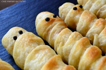 Parmi les recettes, difficiles d’en trouver qui ne me coupent pas l’appétit. Voici quand même deux jolies idées : des gressins en forme d’os chez Chef Nini et des saucisses transformées en momies sur le blog C’est Maman qui l’a fait.