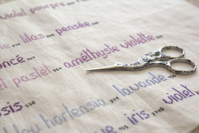 Je continue de broder le nuancier, une couleur chaque jour, mais j’ai un peu de retard pour vous le montrer ici. Voici les deux étapes que j’ai terminées au cours des dernières semaines. Les couleurs roses sont finies, place aux violets et aux bleus.