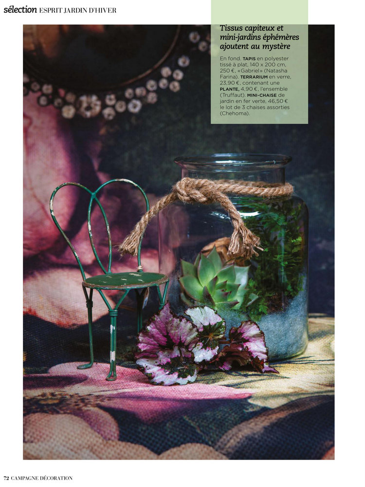 - Dans Campagne Décoration, des maisons décorées pour Noël (j’adore la chambre des enfants décorée pour Noël), des tables de fêtes. On y trouve aussi plein d’idées déco, et une sélection de cadeaux, comme ce joli terrarium (Truffaut).
