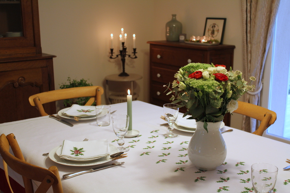 Pour le jour de Noël, j’ai ressorti, de nouveau, ma nappe brodée de houx,